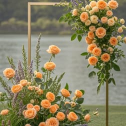Price: $351.00Rustic Wooden Wedding Arch with Orange & White Rose Design(Fresh flowers or Silk flowers)